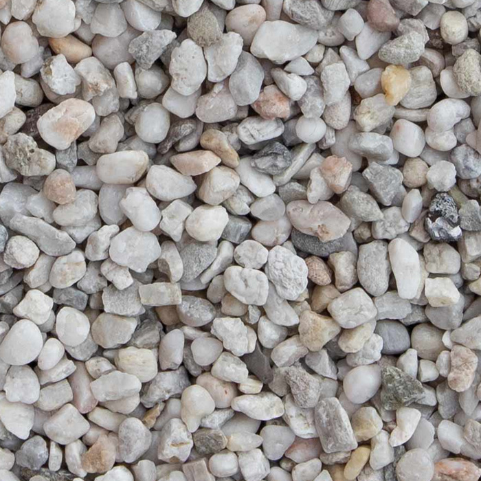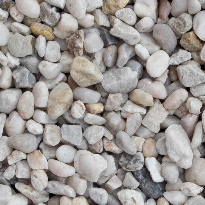 Het grind is samengesteld uit natuurlijke kwartssteentjes met een witte tot lichtgrijze tint. Deze kleur zorgt voor een frisse, heldere uitstraling en geeft de tuin optisch meer ruimte. Ook in de schaduw behoudt het materiaal zijn lichte karakter, waardoor het goed inzetbaar is in minder zonnige delen van de tuin.