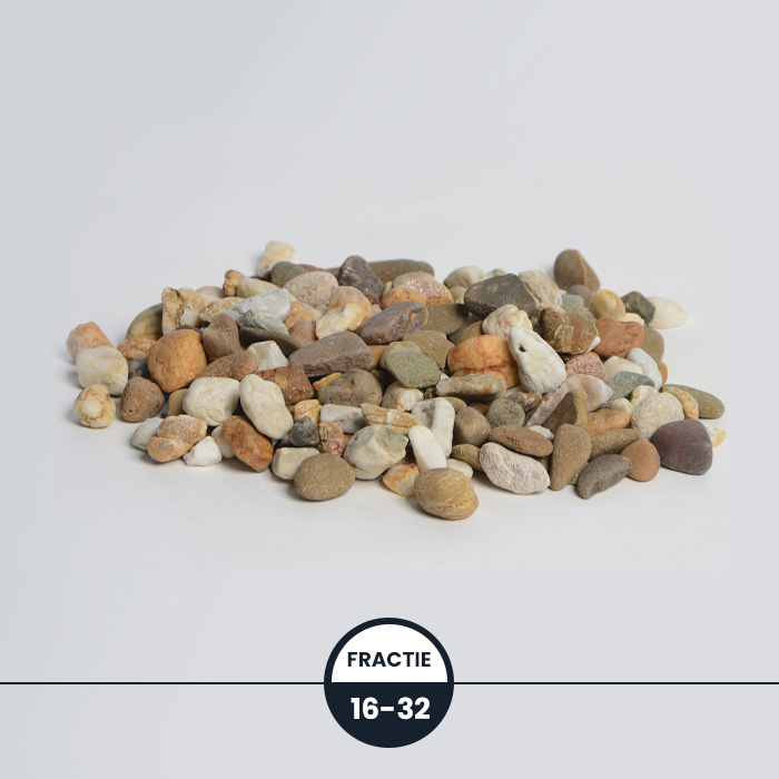 Boerengrind 16-32mm is een grover formaat riviergrind dat bekendstaat om zijn ronde vormen en natuurlijke kleurvariatie. Deze grindsoort wordt ook verkocht onder de namen maasgrind, bont grind en grind genuanceerd. Dankzij het grotere formaat is het uitermate geschikt voor decoratieve toepassingen in tuinen, borders en waterpartijen.
