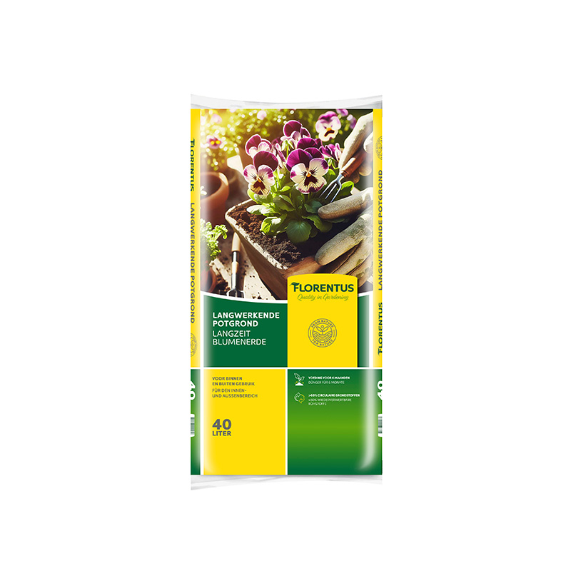 Florentus Potgrond Langwerkend is een kant-en-klare potgrond met een uitgebalanceerde samenstelling van veen, compost en boomschors. Deze potgrond bevat een langwerkende meststof die geleidelijk voeding vrijgeeft, tot wel zes maanden lang. Ideaal voor planten die continu behoefte hebben aan voedingsstoffen, zonder dat je tussendoor extra hoeft bij te mesten.