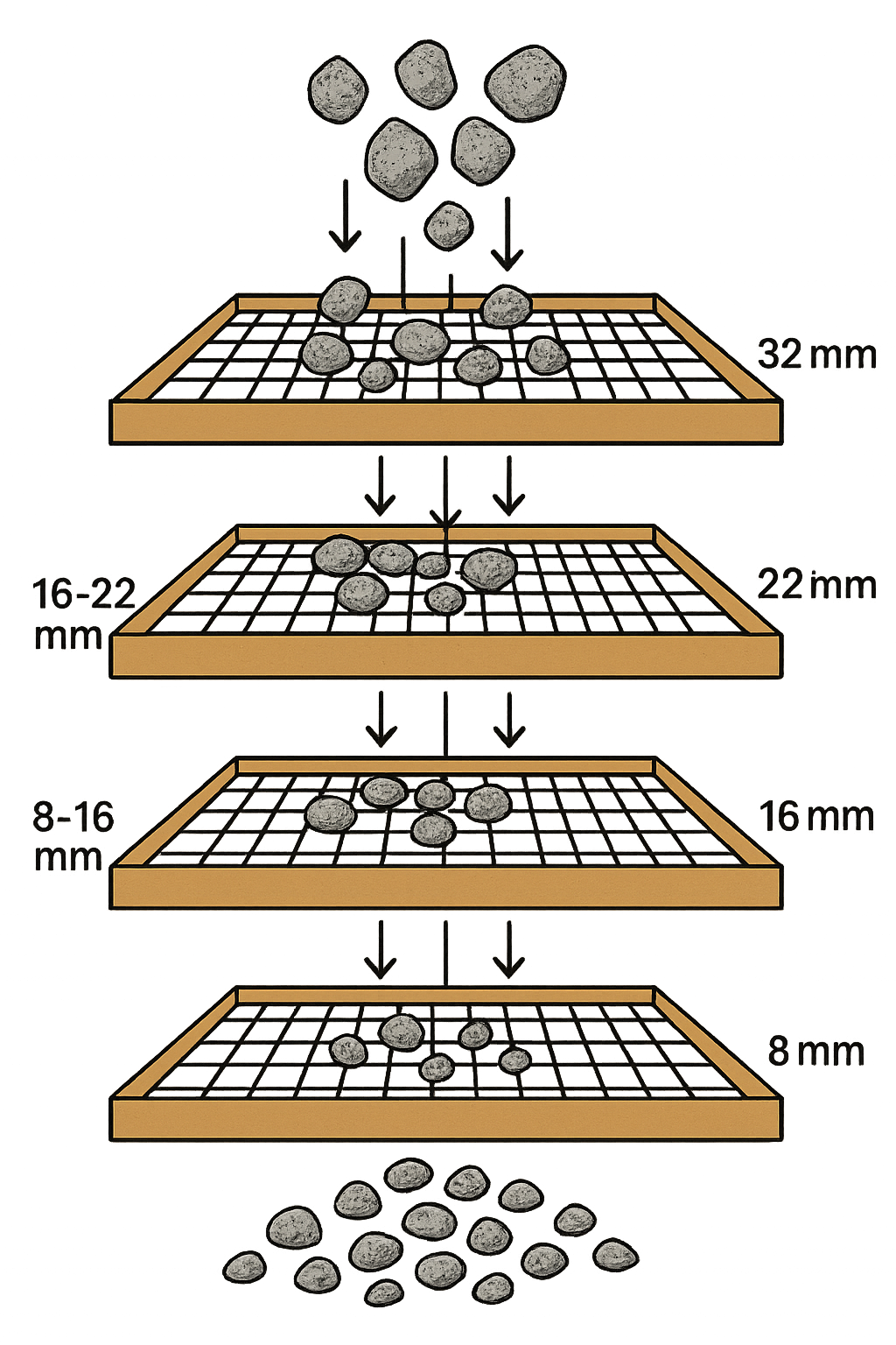 Wanneer grind of split wordt geproduceerd, wordt het materiaal gesorteerd op grootte. Dat gebeurt via een zeefproces, waarbij de stenen door zeven met verschillende maaswijdtes gaan. Zo ontstaat de bekende maatvoering, zoals 16–22 mm of 8–16 mm.